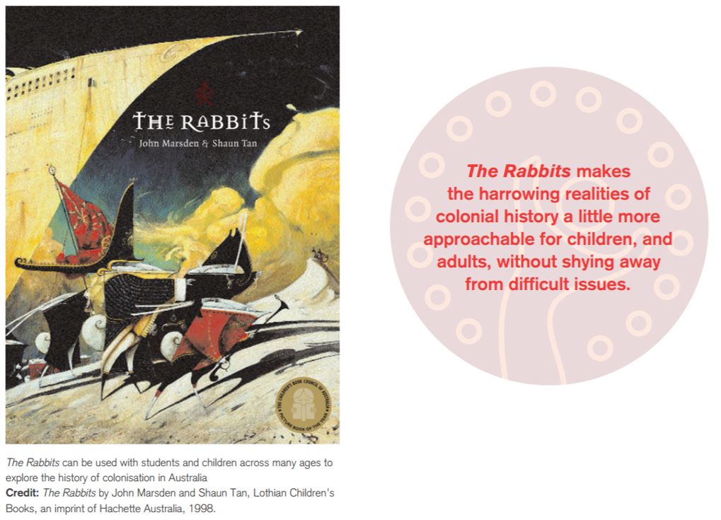 Like the production, The Rabbits by John Marsden with illustrations by Shaun Tan is popular with teachers and educators because it makes the harrowing realities of colonial history a little more approachable for children, and adults, without shying away from difficult issues.